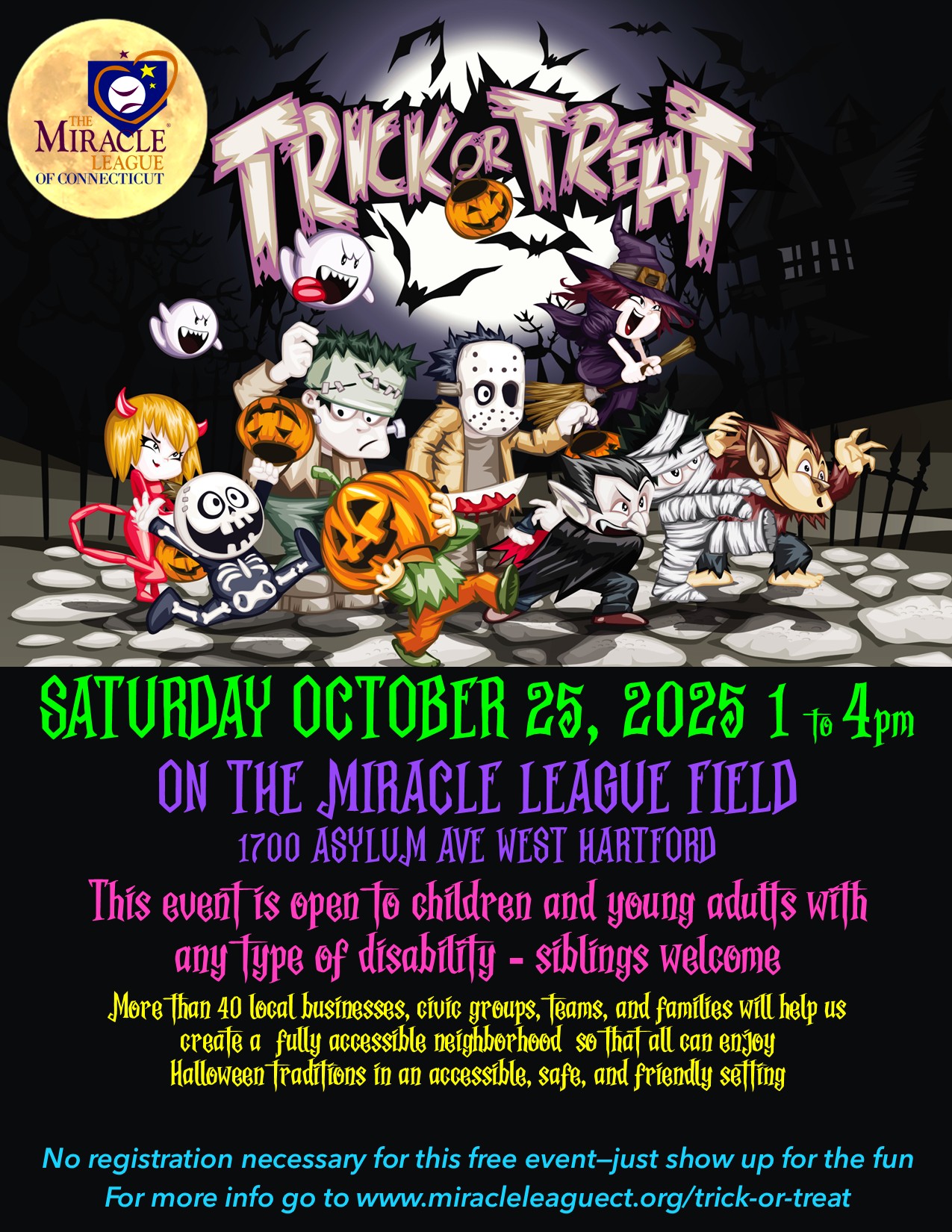 Local businesses, civic groups, teams, and families will unite to transform our Miracle League Field into an accessible neighborhood. Located at 1700 Asylum Ave. in West Hartford (at the intersection of Trout Brook Dr. and Asylum Ave.), we invite you to join us as we greet the ghouls and goblins to our accessible neighborhood. This event is free for everyone, with no registration required. Simply don your favorite costume and come to gather treats—and perhaps a few tricks.